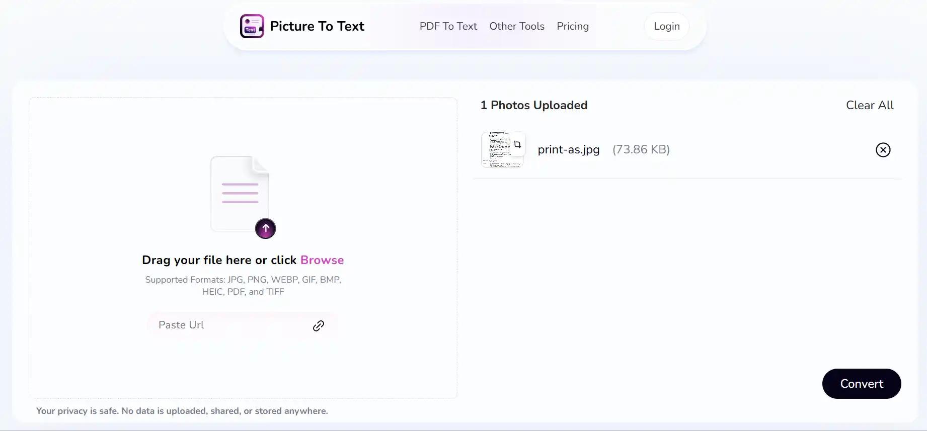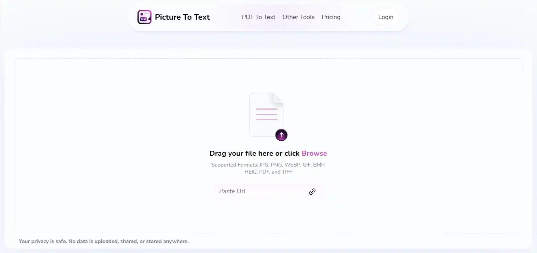 Go to your browser and search for “picture to text”. Many tools will appear in the search results. You can choose any of those online tools. I did the same and chose an image to text converter tool that I found reliable in my testing. That’s how the tool’s interface looks:
