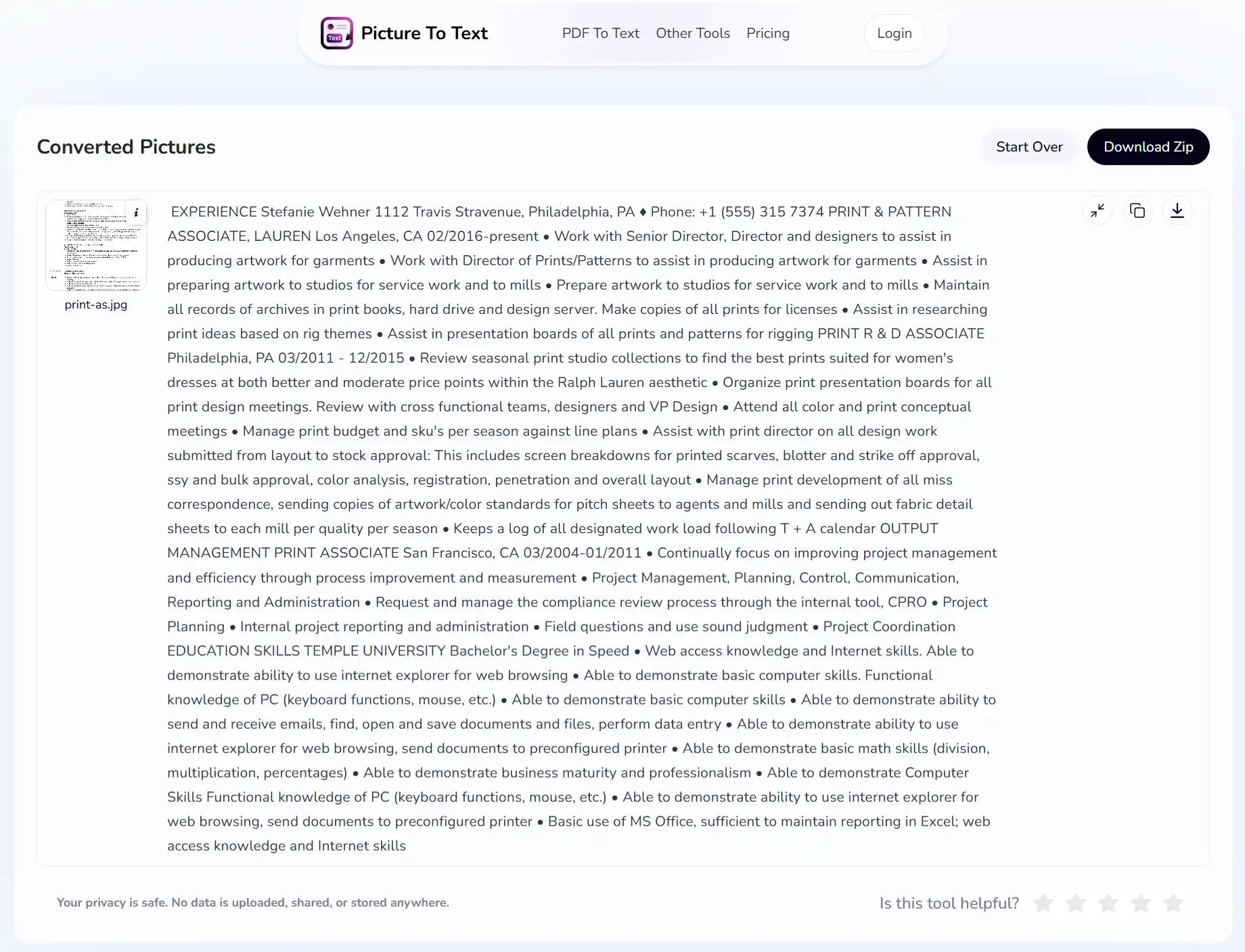Your text is ready to be copied or downloaded. That’s all it takes to make the text inside your old resume ready to edit and update. This simple process can save you hours of manual typing. This not only saves time but also ensures that you don’t miss any information from your old resume.